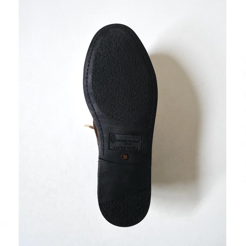 ◆ ビスポーク靴職人のアントニオ・ピオ・メーレ氏が、1999年に工房とショールームを兼ねた店舗をミラノで創業。確かな職人技術に、稀少な素材を惜しげも無く使用した世界に唯一のビスポークシューズは、世界の王族や貴族など、多くの顧客を魅了しています。そんな、ビスポーク職人が手掛ける本格派のシューズ。 こちらは、サンドベージュのチャッカブーツ。モデルは「BORA」です。 履き心地の良さに驚き、実際に使ってみて、足に優しい靴として手放せなくさせるのは、究極のラバーソールと呼ぶフランスRELTEX社の「LACTAE HEVEA(ラクト・エヴィア)」のおかげ。長時間履いていても疲れない、足に優しいソールなんです。車社会の歩かない生活に慣れた、ひ弱な足をもフォローしてくれます。 今回、「BORA」で新たに加えたのがブラウン( MARRONE)。ソールをブラックにしたのは初めてで、ダークブラウンより華やかな中茶と黒ソールの組み合わせ。もし自分が次に揃えるなら、この配色かなと独断と偏見で選ばさせていただきました。ソールを黒にすることで、コーディネートの幅はさらに広がるはずです。