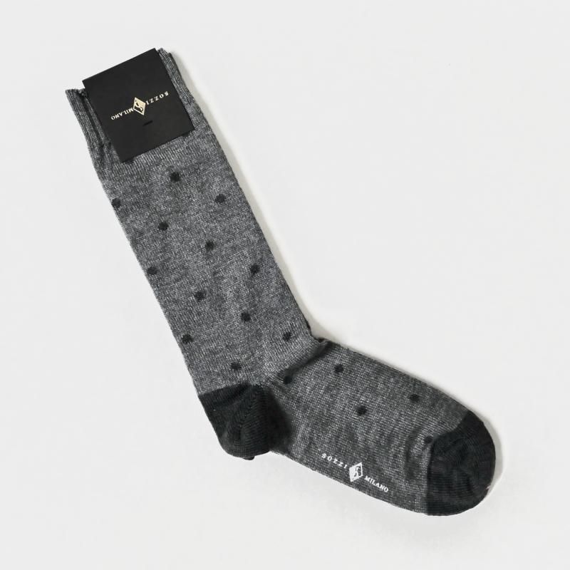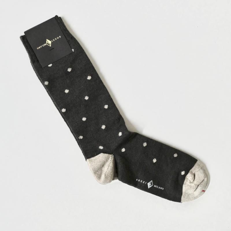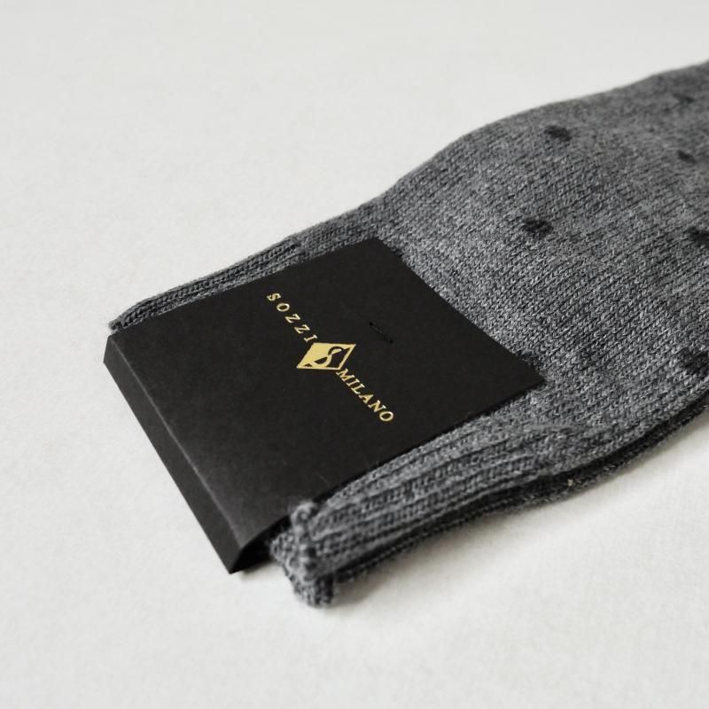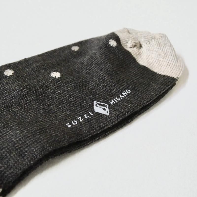 ◆ 1912年創業、ミラノでハンドメイドのソックスを作り始め、現在ではイタリアンクラシックの代表的なソックスブランドとして名を馳せ、イタリアの有名ショップであれば必ずと言ってよいほど、【SOZZI/ソッツィ】のソックスが並んでいると言われています。 足先から踵、ふくらはぎまで立体裁断による巧みな技術。特につま先をハンドリンキングで仕上げることで素晴らしい履き心地とフィット感を実現しています。 足元にも個性を。ただ目立つのではなく、あくまでもさりげなくと選んだのが、ドット柄。無地と同じ素材になります。ブラウン、グレイ、ブラックと落ち着いた色合い。グラデーションのアクセントで派手になることはなく、柄との間隔も広いため、柄物のパンツを穿いたとしても、柄同士が喧嘩することはありません。もちろん柄にもよります。