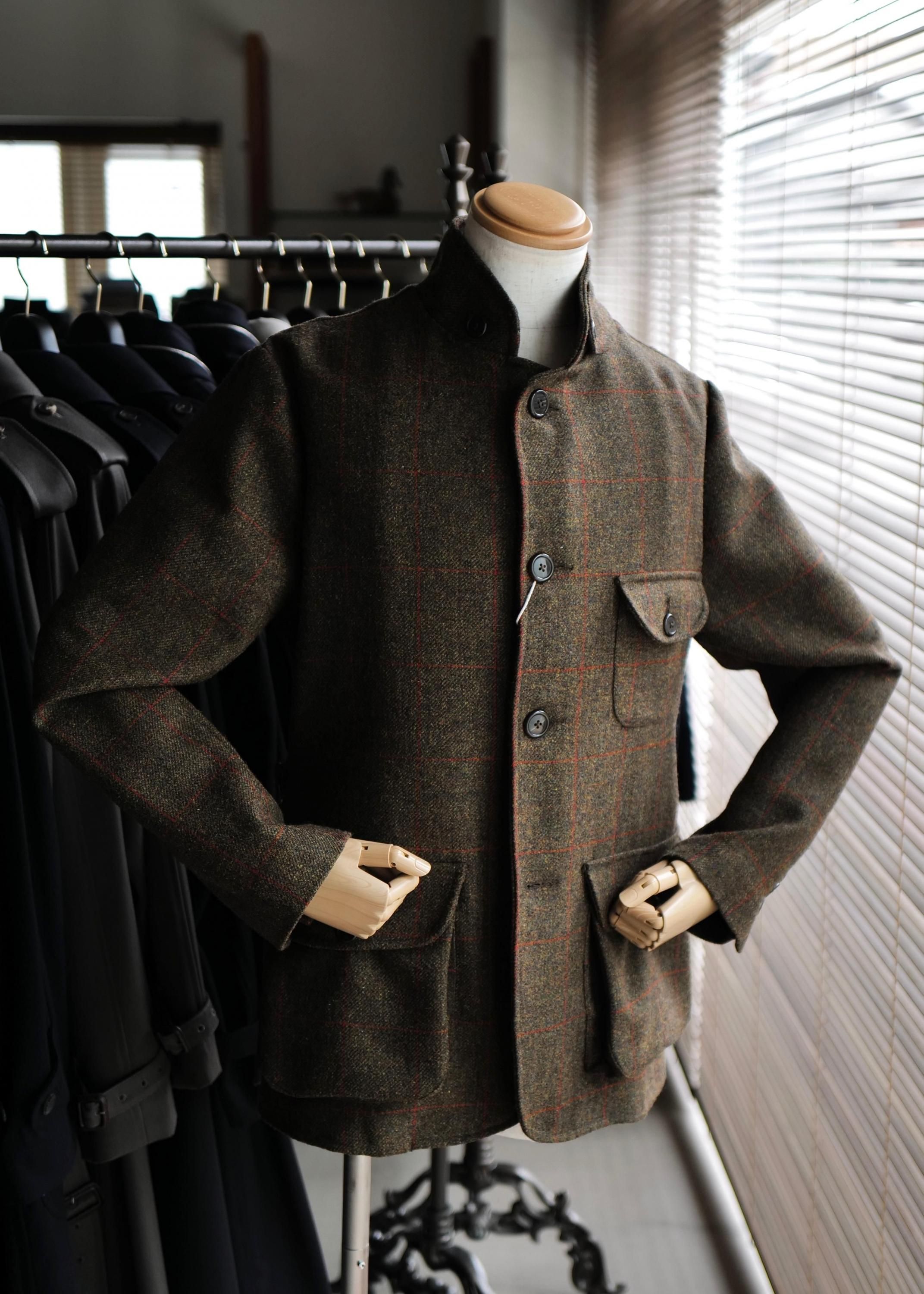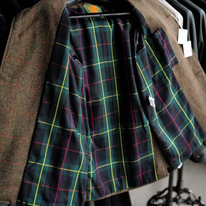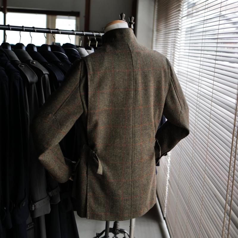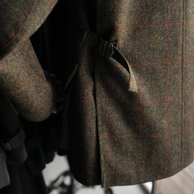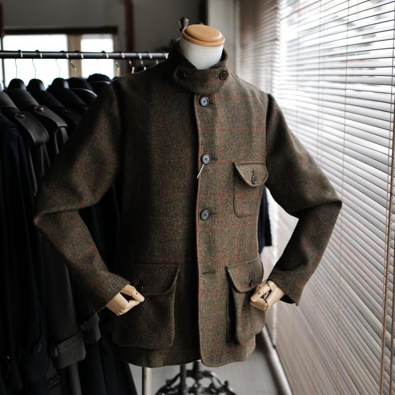 今季から取り扱いをスタートすることになった、フランス老舗の【BERTEIL/ベルテイユ】から1920年代から2000年代まで続いていたnovasportと呼ばれるクラススポーツの復刻洋服ラインです。ブランドの中のコレクションですが、自立しておりややこしいですが、正式なブランド名は【NOVA SPORT BY BERTEIL/ノバスポーツバイベルテイユ】かなりマニアックですが、本場ではクラシックな狩猟用、ドレス、カントリーウェアなど現在も展開しており、日本ではたまにヴィンテージで見かけたりするぐらいです。 フランスで1840年創業の老舗。元々は帽子屋でイタリアで有名な帽子メーカーのボルサリーノ創業者本人が修行していたのが【BERTEIL/ベルテイユ】だったりしま ご用意したのはモデル名「Byron」。バイロンの名前は19世紀の英国で有名な貴族詩人の方が由来になっています。 【NOVA SPORT BY BERTEIL/ノバスポーツバイベルテイユ】を代表するモデルの1つで、貴族の軍服をベースに仕立てられたハンティングジャケット。軍服であっても高貴な雰囲気を重んじるフランスならではの表情が魅力的です。 小ぶりな立ち襟のオフィサーカラーにカッティングの美しいフラップ付きマチポケットなど、伝統的なディテールを復刻しています。 現代のフランスでは富裕層向けの日常着として愛用者の多い【BERTEIL/ベルテイユ】ですが、クワイエットラグジュアリーさがエレガントな大人のフレンチスタイルです。 生地は【BERTEIL/ベルテイユ】が選ぶ重厚なツイード。 カントリーな印象ですが、よく見ていただくとウインドウペンは華やかなオレンジカラーとなっており、全体的に重すぎない美的センスを感じるツイードです。 多色ミックスのオリーブに走るウインドウペンが色気にも繋がります。 袖口はやや大きめなボタンが並び、本切羽となっておりました。個人的な決め手はサイドからの素晴らしいスタイル。 次元の違う普通ではやらないような手間の掛かる拘りと、手の込みすぎたディテールの仕上がり。 袖付けも独特な仕様で程よくギャザーを施しならがら丸みを持たせ可動域と袖の収まり、そして肩の部分を立体的に魅せる仕上げです。 ウエストのサイドアジャスターと繋がっている通常見られないかなり深いアクションプリーツにの曲線も身体に沿って美しいカーブを描きます。 共生地のエルボパッチが施されているのも見逃せません。裏地は48サイズのみロイヤルスチュワートとなっており、他のサイズはマッケンジータータンチェックになっております。