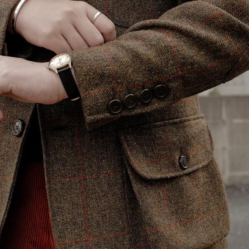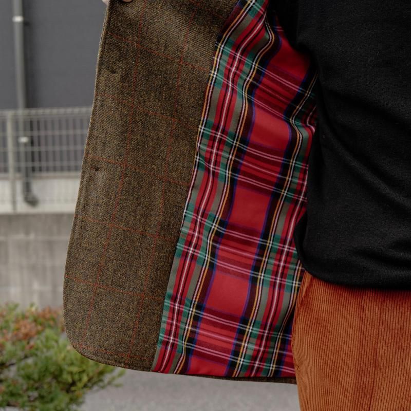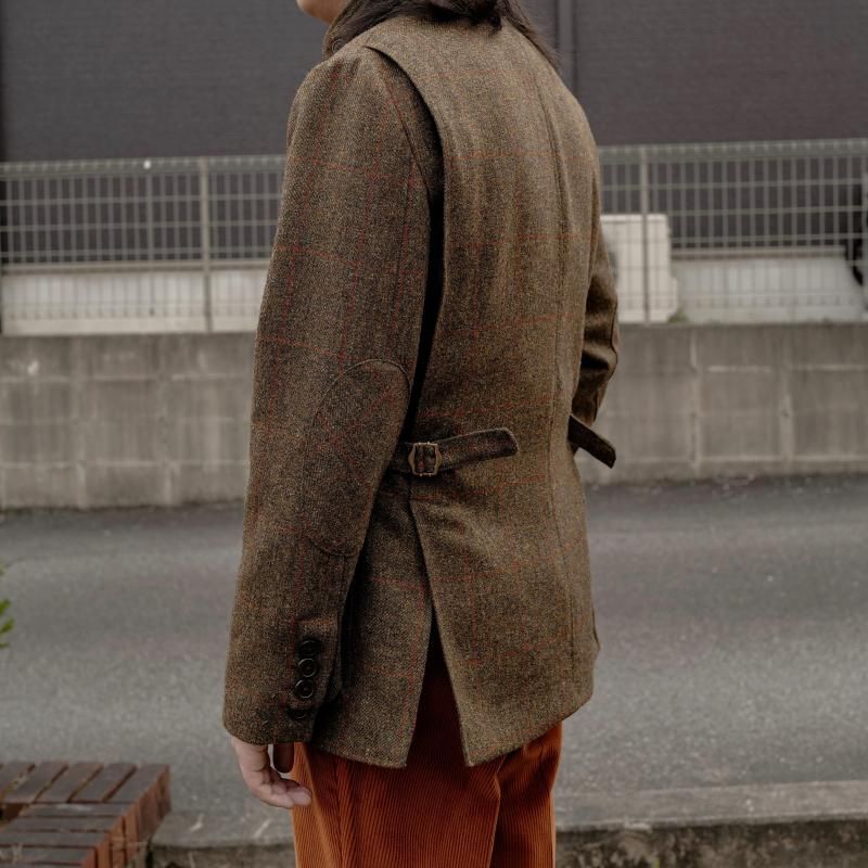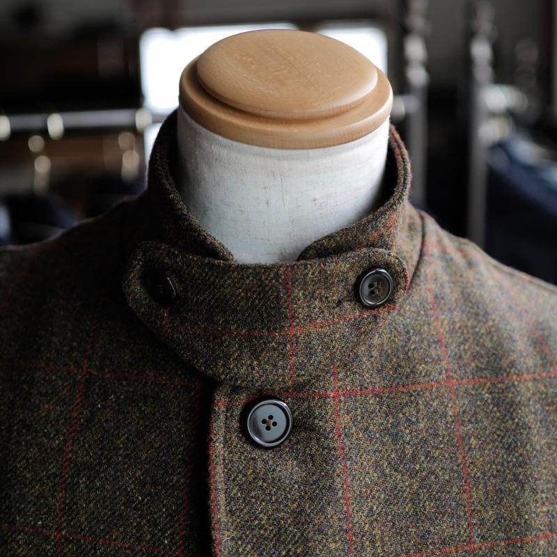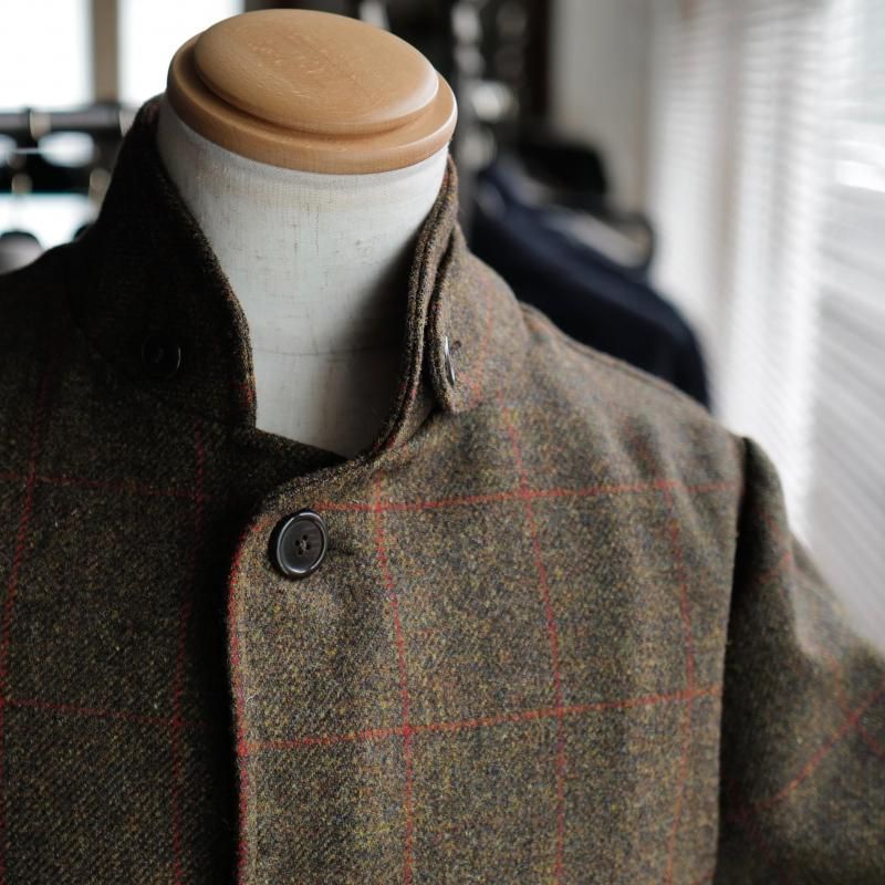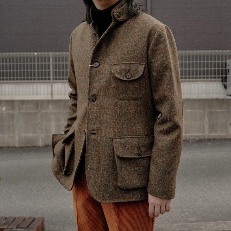 今季から取り扱いをスタートすることになった、フランス老舗の【BERTEIL/ベルテイユ】から1920年代から2000年代まで続いていたnovasportと呼ばれるクラススポーツの復刻洋服ラインです。ブランドの中のコレクションですが、自立しておりややこしいですが、正式なブランド名は【NOVA SPORT BY BERTEIL/ノバスポーツバイベルテイユ】かなりマニアックですが、本場ではクラシックな狩猟用、ドレス、カントリーウェアなど現在も展開しており、日本ではたまにヴィンテージで見かけたりするぐらいです。 フランスで1840年創業の老舗。元々は帽子屋でイタリアで有名な帽子メーカーのボルサリーノ創業者本人が修行していたのが【BERTEIL/ベルテイユ】だったりしま ご用意したのはモデル名「Byron」。バイロンの名前は19世紀の英国で有名な貴族詩人の方が由来になっています。 【NOVA SPORT BY BERTEIL/ノバスポーツバイベルテイユ】を代表するモデルの1つで、貴族の軍服をベースに仕立てられたハンティングジャケット。軍服であっても高貴な雰囲気を重んじるフランスならではの表情が魅力的です。 小ぶりな立ち襟のオフィサーカラーにカッティングの美しいフラップ付きマチポケットなど、伝統的なディテールを復刻しています。 現代のフランスでは富裕層向けの日常着として愛用者の多い【BERTEIL/ベルテイユ】ですが、クワイエットラグジュアリーさがエレガントな大人のフレンチスタイルです。 生地は【BERTEIL/ベルテイユ】が選ぶ重厚なツイード。 カントリーな印象ですが、よく見ていただくとウインドウペンは華やかなオレンジカラーとなっており、全体的に重すぎない美的センスを感じるツイードです。 多色ミックスのオリーブに走るウインドウペンが色気にも繋がります。 袖口はやや大きめなボタンが並び、本切羽となっておりました。個人的な決め手はサイドからの素晴らしいスタイル。 次元の違う普通ではやらないような手間の掛かる拘りと、手の込みすぎたディテールの仕上がり。 袖付けも独特な仕様で程よくギャザーを施しならがら丸みを持たせ可動域と袖の収まり、そして肩の部分を立体的に魅せる仕上げです。 ウエストのサイドアジャスターと繋がっている通常見られないかなり深いアクションプリーツにの曲線も身体に沿って美しいカーブを描きます。 共生地のエルボパッチが施されているのも見逃せません。裏地は48サイズのみロイヤルスチュワートとなっており、他のサイズはマッケンジータータンチェックになっております。