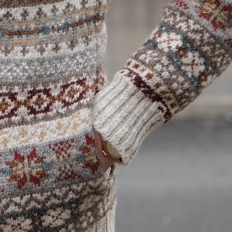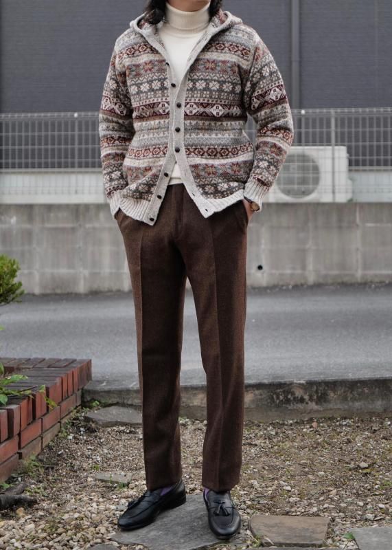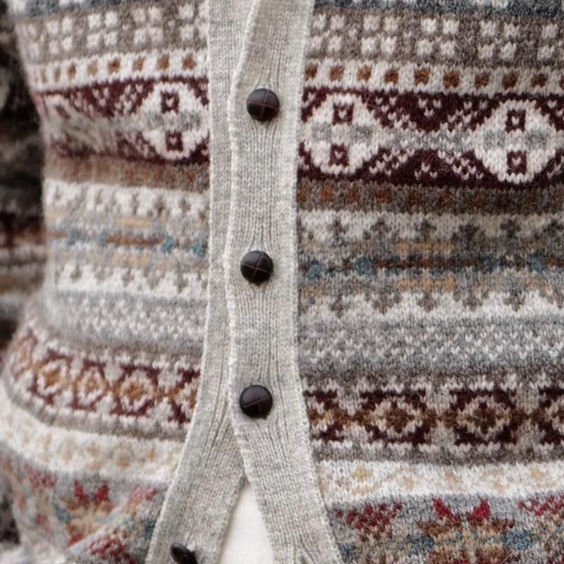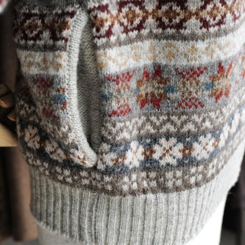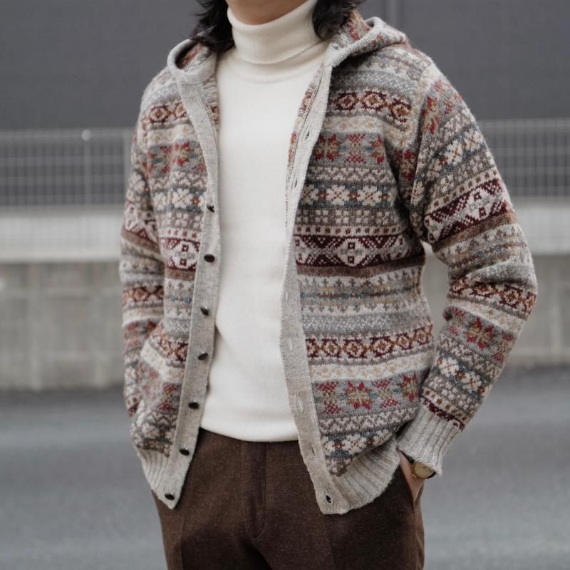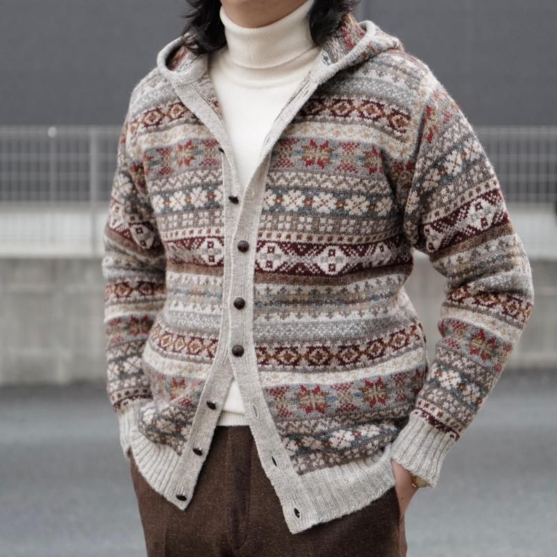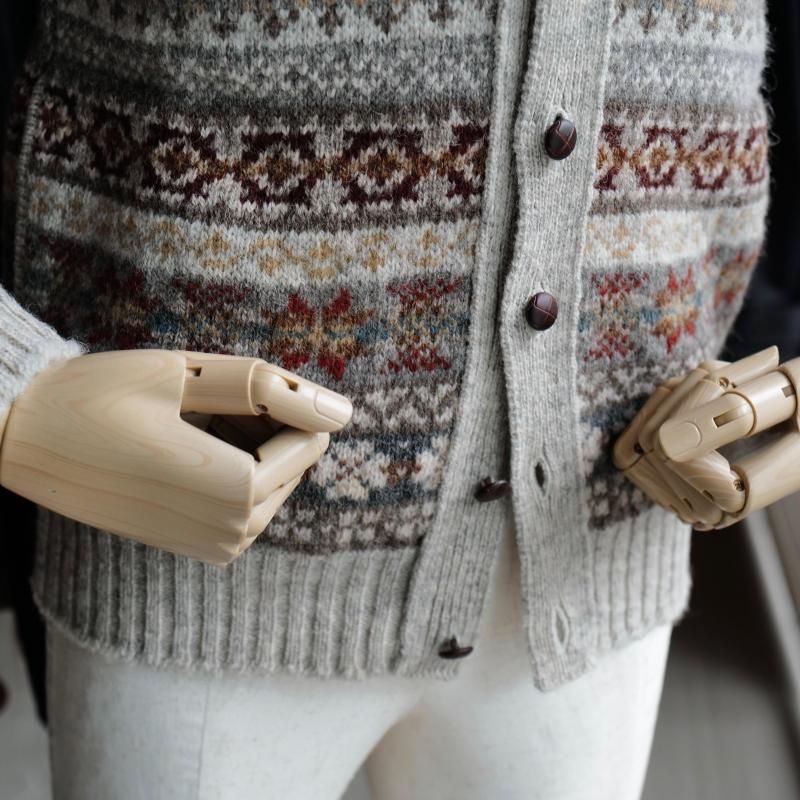 ご用意したのは、無数のカラーリング組み合わせがあるフェアアイル柄。 グレイッシュな色合いをベースにし暖かみある色目をミックスさせた上品な雰囲気が特徴です。 派手でも地味でもない絶妙な色合いを見つけたと自画自賛したくなります。 【JAMIESON`S/ジャミーソンズ】のニットウェアに使われる糸は極寒の地域で育った羊から取られる羊毛を丁寧に紡ぎ、天然染料による自然な風合いのシェットランドウールを使用。 ボタンの数が多いのも隙間を埋めてくれるだけでなく、縦のラインをシャープに魅せてくれています。