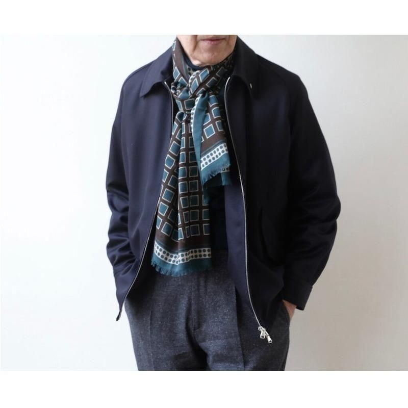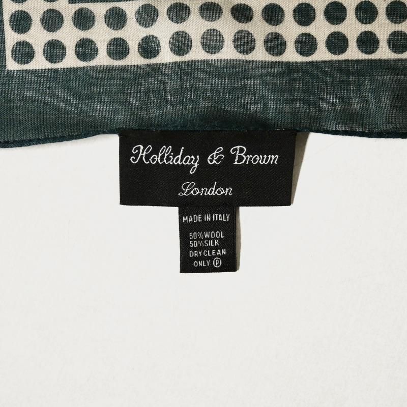 ◆ 1926年、Aubrey Brown氏とブラウン家の古くからの友人であった Holliday氏によって設立された英国の老舗ネクタイブランド。もともとは、1919年、Aubrey Brown氏がバーリントン・アーケードにシルクネクタイを扱うショップをオープンしたのが始まりです。 2000年、イタリアでシルク産業をリードするマンテロ・セタ社 (Mantero Seta)によって、118巻を超える膨大なデザインアーカイブやサンプル共に受け継がれました。これまで守ってきた英国の伝統と世界的に有名なイタリア・コモ湖のシルク産業の知識が融合し、今日の【Holliday&Brown/ホリデイ&ブラウン】があります。 ウール50・シルク50の毛羽のないドライな肌触りが軽快な襟元を演出します。温度調整に優れるウールと肌感覚に近いシルクの混紡であれば、晩秋から春までと長いシーズン使っていただけます。 ブルゾンやコート以外の、例えばニットにさらりと巻くだけで表情はずいぶん華やかに。マフラーほど大袈裟にならずに、コンパクトな使い方のできるストール。今季、オススメのアイテムです。 ジャスパーグリーン(碧玉)は、くすんだ青みのあるグリーン。暗い灰みのあるダークブラウン(焦茶)。この2色を引き立てているのがベージュです。ウール・シルクならではの掠れた風合いが色合いを抑え、大胆な柄もシックに魅せます。