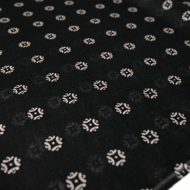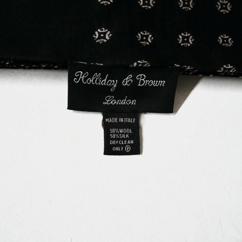 ◆ 1926年、Aubrey Brown氏とブラウン家の古くからの友人であった Holliday氏によって設立された英国の老舗ネクタイブランド。もともとは、1919年、Aubrey Brown氏がバーリントン・アーケードにシルクネクタイを扱うショップをオープンしたのが始まりです。 2000年、イタリアでシルク産業をリードするマンテロ・セタ社 (Mantero Seta)によって、118巻を超える膨大なデザインアーカイブやサンプル共に受け継がれました。これまで守ってきた英国の伝統と世界的に有名なイタリア・コモ湖のシルク産業の知識が融合し、今日の【Holliday&Brown/ホリデイ&ブラウン】があります。 ウール50・シルク50の毛羽のないドライな肌触りが軽快な襟元を演出します。温度調整に優れるウールと肌感覚に近いシルクの混紡であれば、晩秋から春までと長いシーズン使っていただけます。 ブルゾンやコート以外の、例えばニットにさらりと巻くだけで表情はずいぶん華やかに。マフラーほど大袈裟にならずに、コンパクトな使い方のできるストール。今季、オススメのアイテムです。 ブラックベースにベージュ、いや、フランス語で肌や肉を意味するシェールの方がイメージです。淡いピンクベージュのオールオーバー柄になります。とてもロマンティックな配色です。