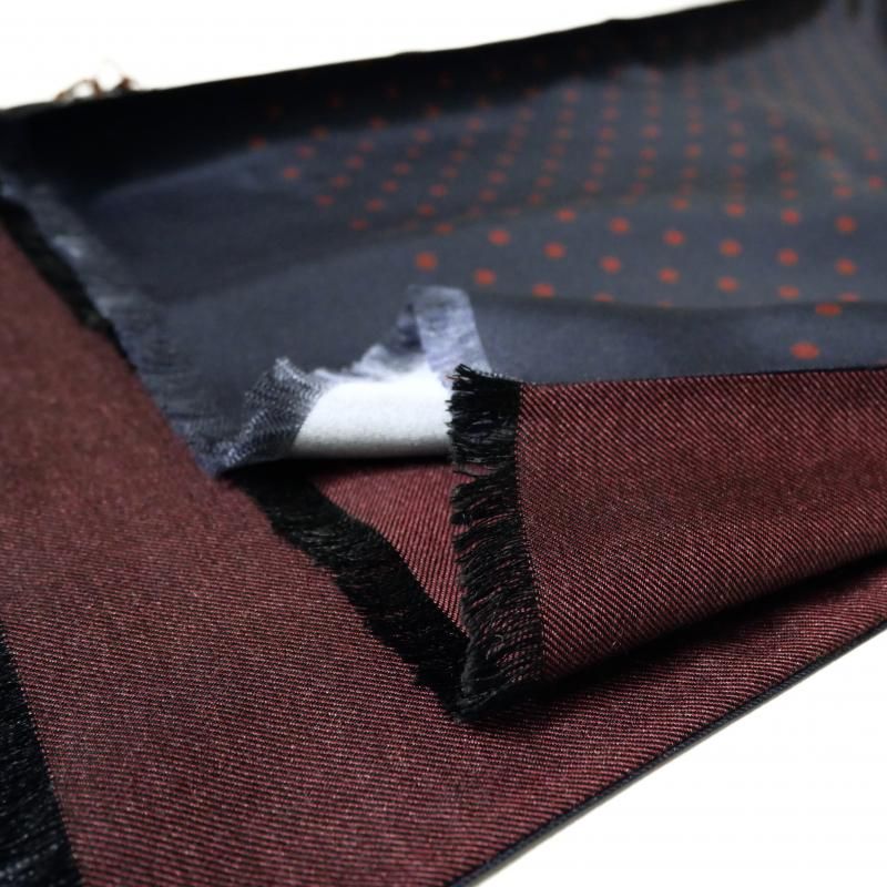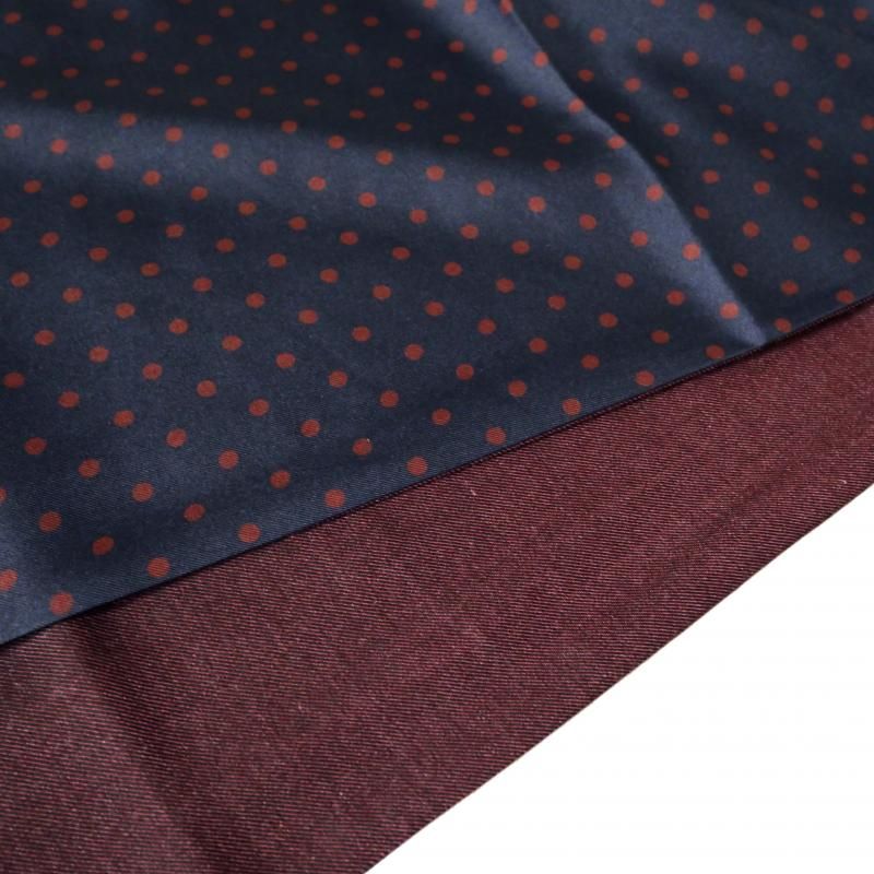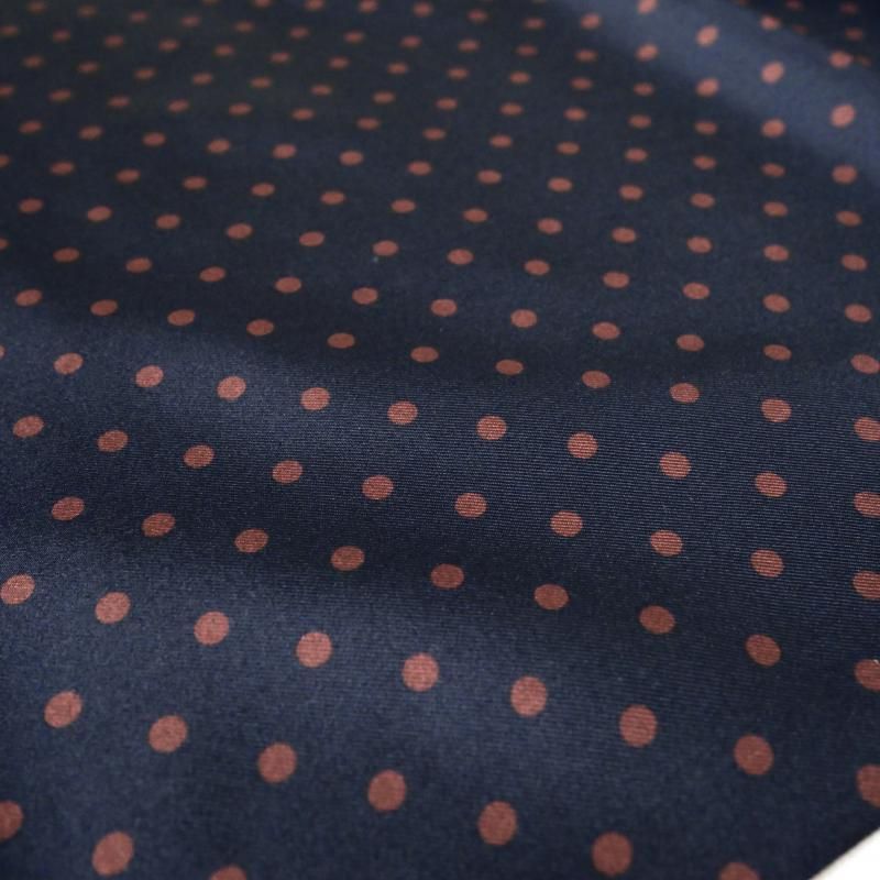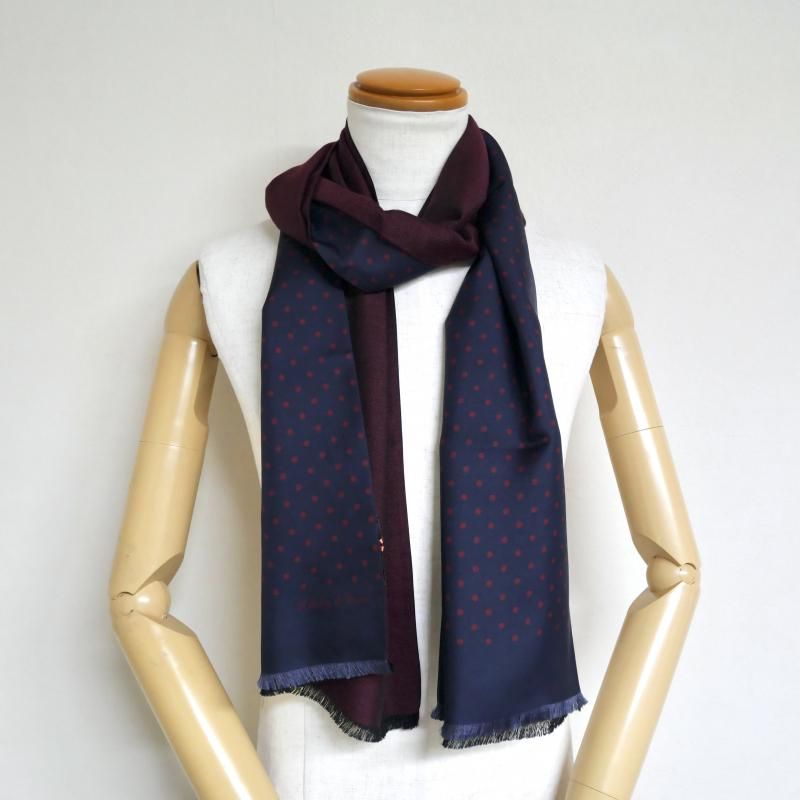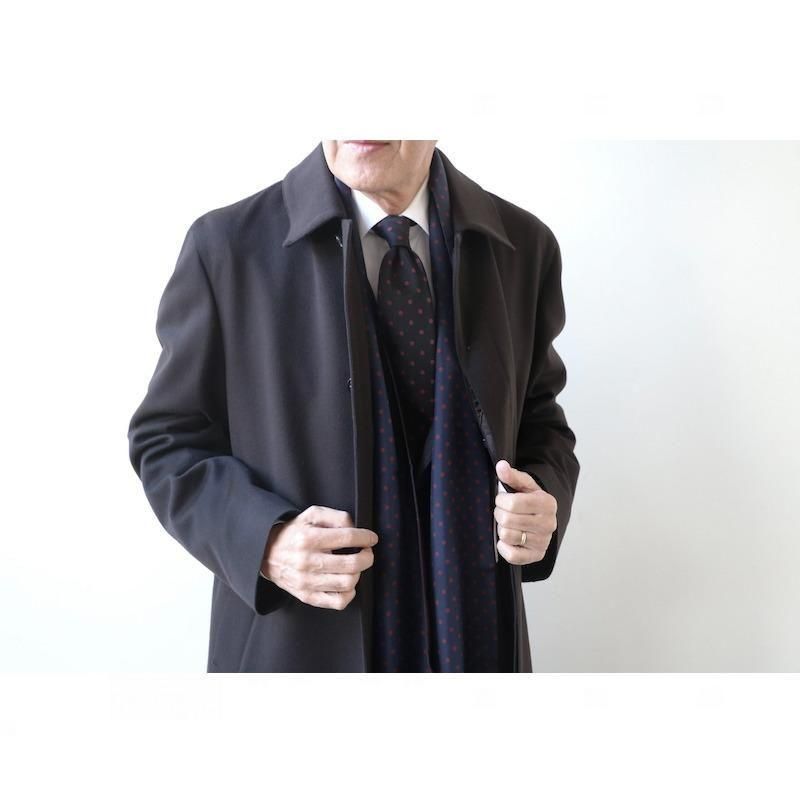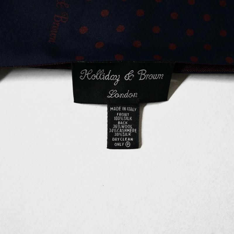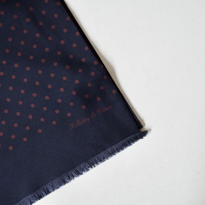 ◆ 1926年、Aubrey Brown氏とブラウン家の古くからの友人であった Holliday氏によって設立された英国の老舗ネクタイブランド。もともとは、1919年、Aubrey Brown氏がバーリントン・アーケードにシルクネクタイを扱うショップをオープンしたのが始まりです。 2000年、イタリアでシルク産業をリードするマンテロ・セタ社 (Mantero Seta)によって、118巻を超える膨大なデザインアーカイブやサンプル共に受け継がれました。これまで守ってきた英国の伝統と世界的に有名なイタリア・コモ湖のシルク産業の知識が融合し、今日の【Holliday&Brown/ホリデイ&ブラウン】があります。 フロントのドット柄はシルク 100%のプリント、バックの無地はウール・カシミア・シルクの混紡素材となんとも贅沢なリバーシブルタイプ。 今季のトレンドのドット柄。老若男女全ての方に受け入れられる古典模様。カルピスが愛されるのも、この柄のおかげかもしれません。針で刺した穴のような小さなものがピンドット、硬貨大がポルカドット、その中間が、このポルカドット。最もポピュラーなドット柄です。 片方をドット柄、もう一方を無地に。あるいは、無地だけを使ってシンプルに巻くのも良いでしょう。